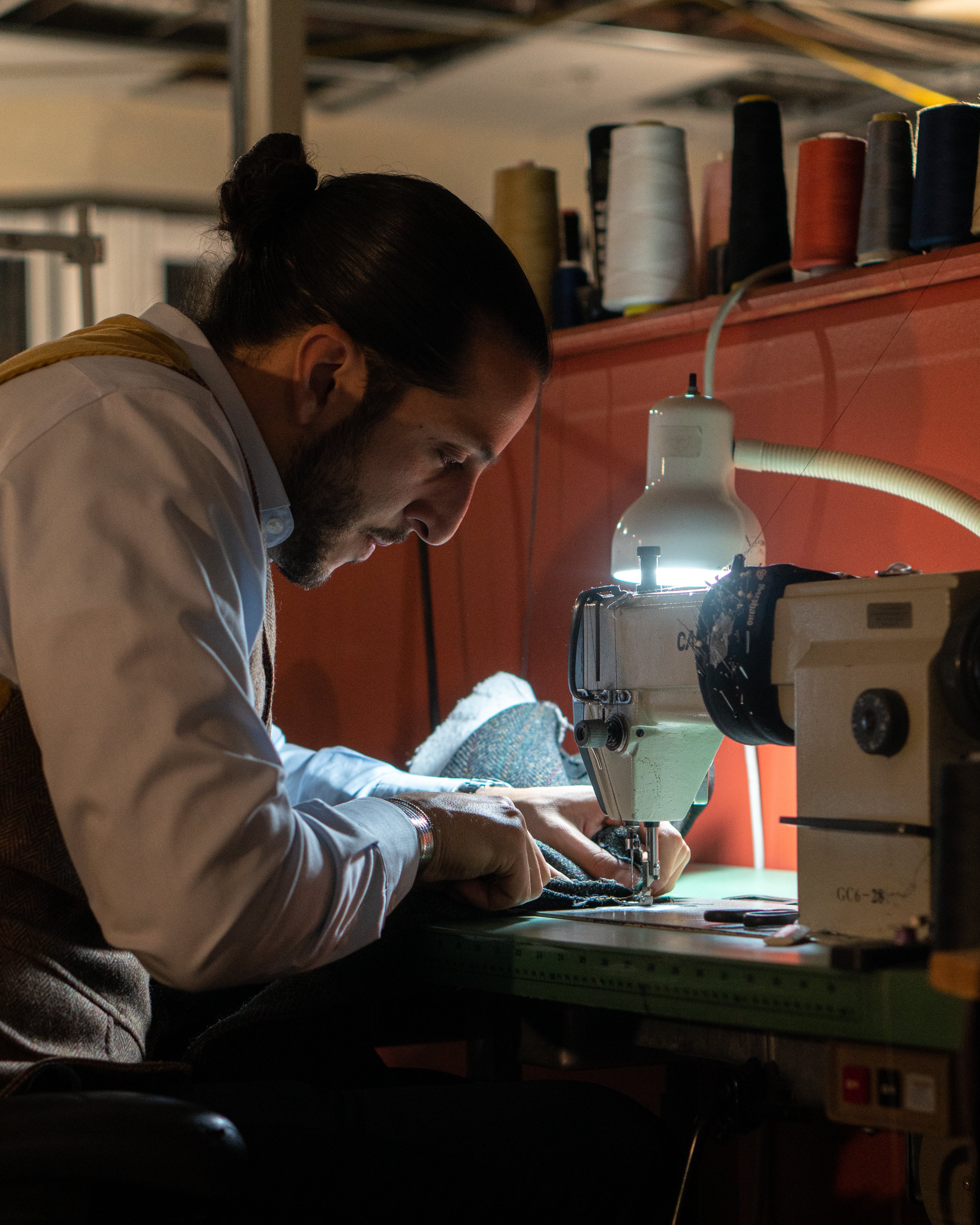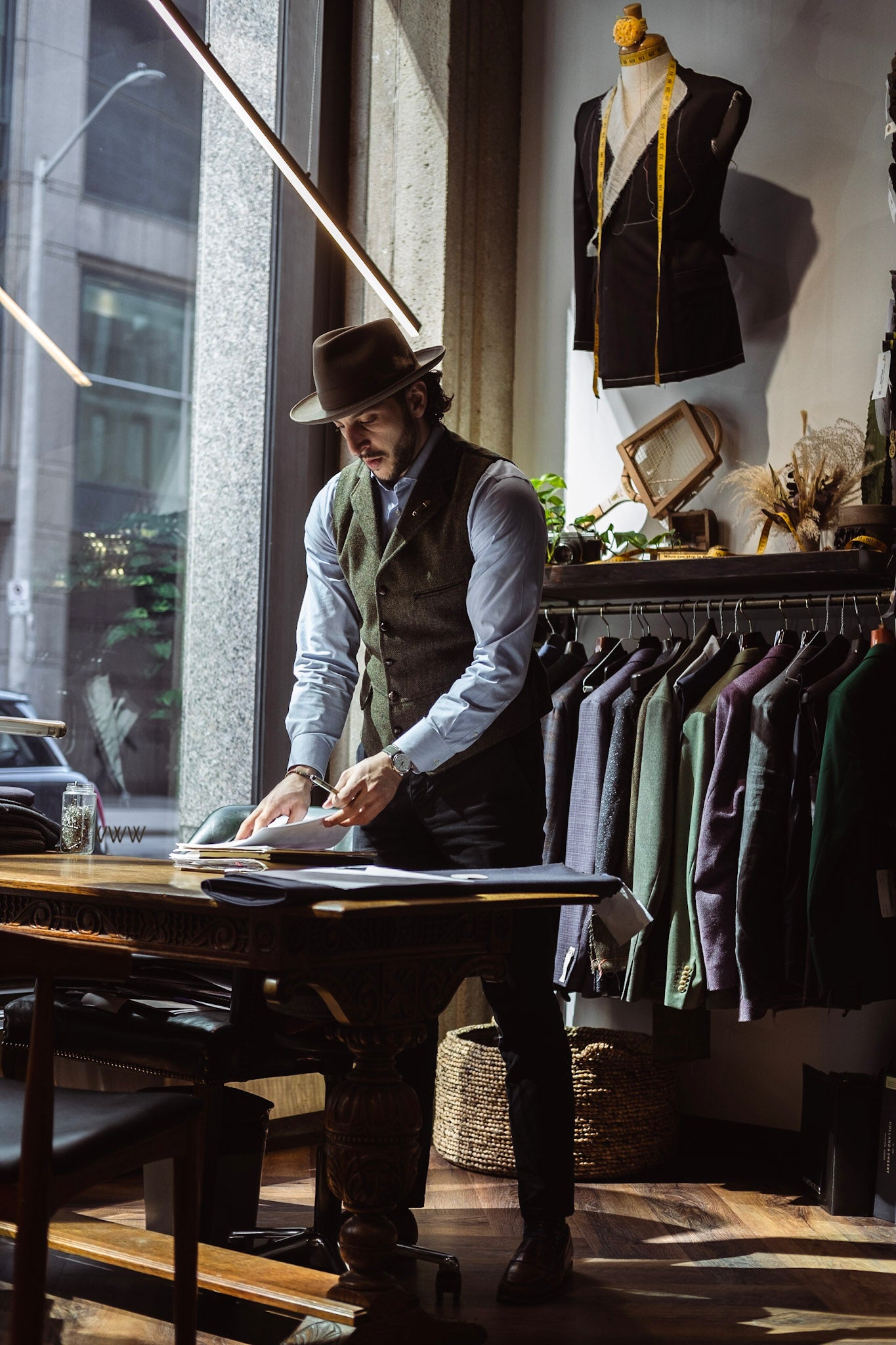 You've heard the term from basically everyone who sells suits, but what does made-to-measure actually mean? Long story short: you get to pick the fun details such as fabric, style, and lining, and we handle the fitting. We have specific models that we've crafted to use as a base when fitting you. We'll try on some garments to get close, and then note any adjustments that need to be made to give you the perfect fit. From there, it's off to our Montreal-based factory to produce your garment. Production usually takes between six and eight weeks, and once we have the completed garment in hand, we'll call you in for a final fitting. Here, we'll check that everything fits perfectly, and if any slight adjustments are needed, we'll take care of them in our in-house workshop.